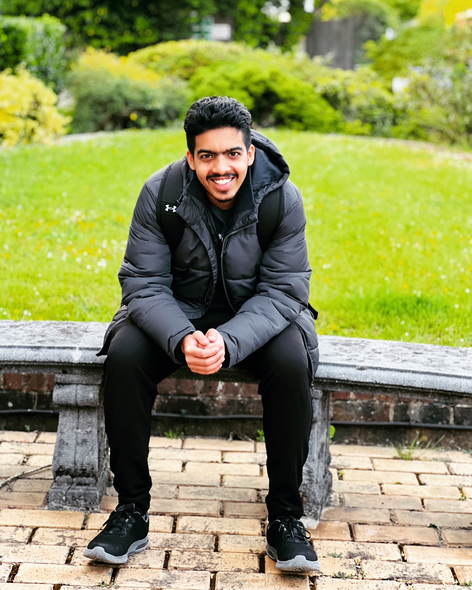 An asian male with black hair and a moustache wearing all black and sat on garden bench with his hands together smiling at the camera with a garden lawn behind him